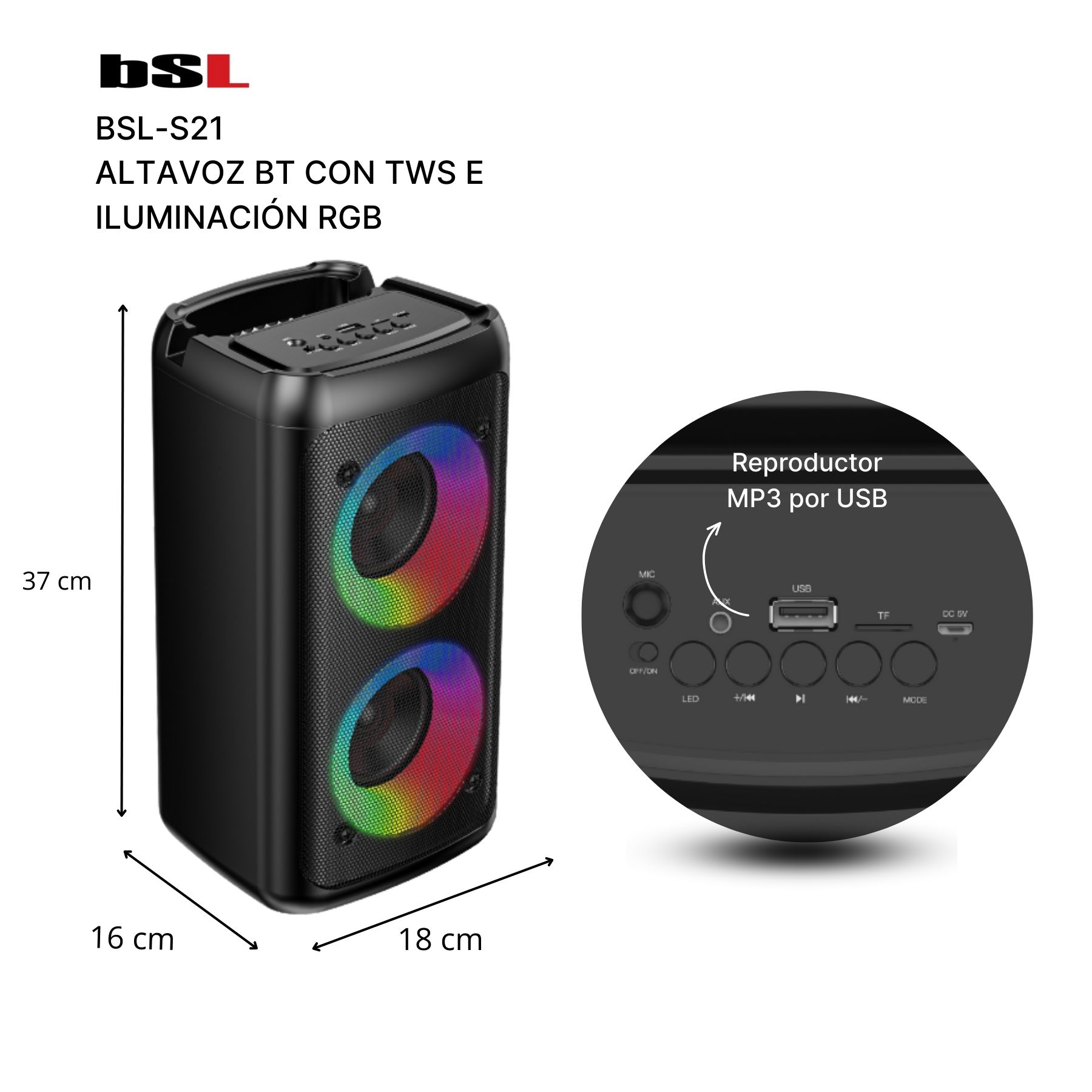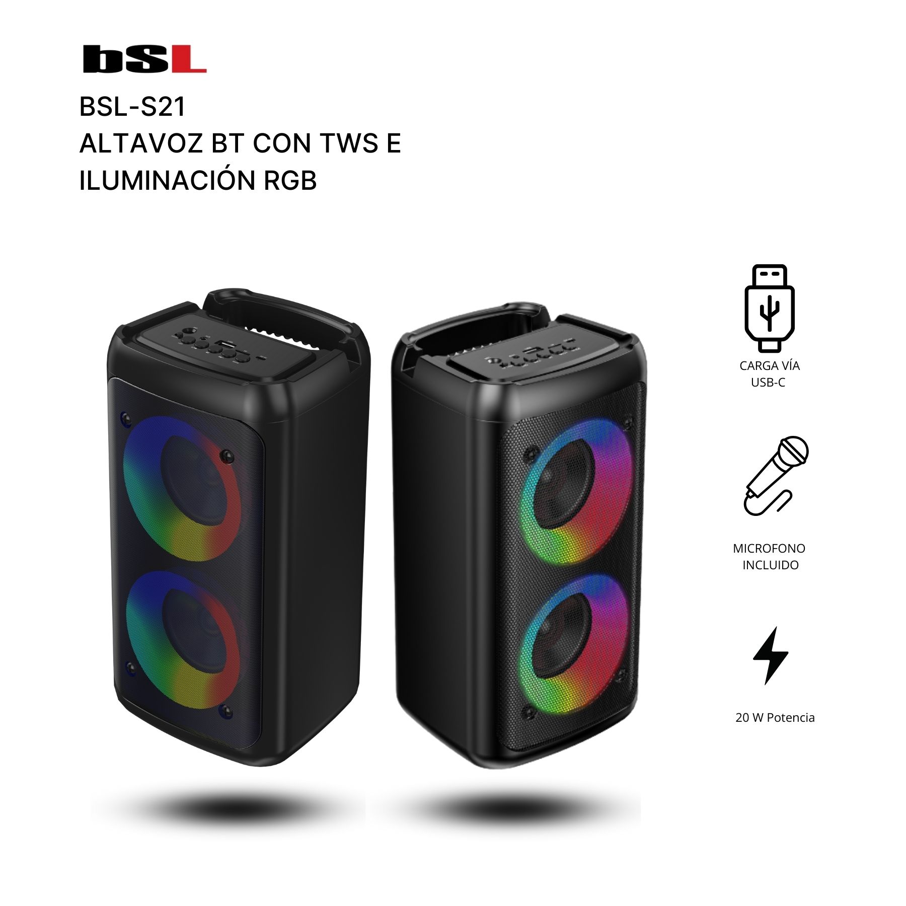 El BSL S-21 es el altavoz perfecto para transformar cualquier reunión en una fiesta. Con 20W de potencia, dos altavoces de 4” y un sonido claro y envolvente, este parlante portátil es ideal para interiores y exteriores. Su diseño moderno incorpora iluminación RGB dinámica, que crea el ambiente ideal para acompañar tu música, juegos, celebraciones o reuniones familiares.