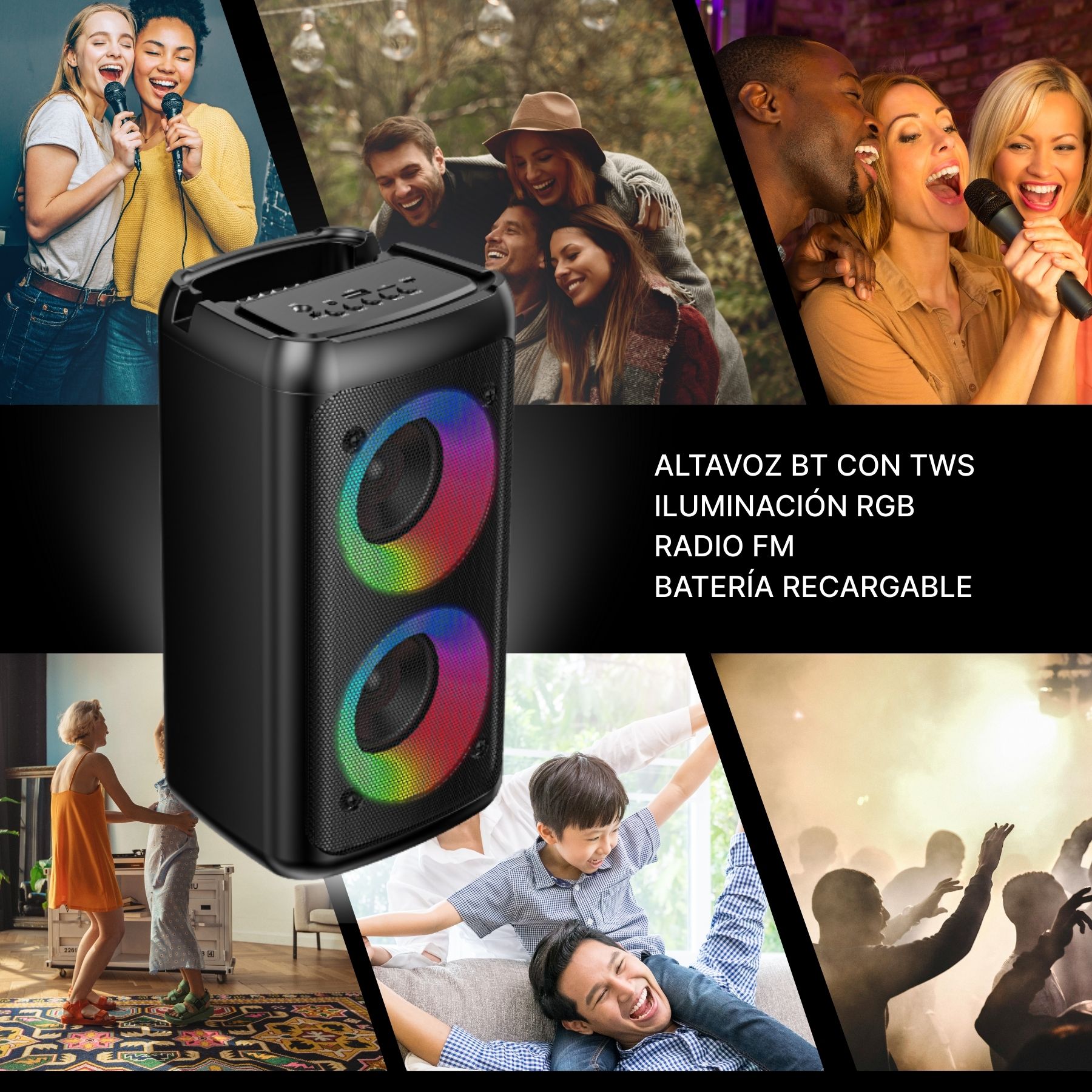 Incluye Bluetooth con función TWS para sincronizar dos unidades y duplicar la experiencia sonora, logrando un efecto estéreo mucho más potente. Además, cuenta con Reproductor MP3 por USB, Radio FM, entrada para micrófono y una batería recargable, permitiendo llevar tu música a donde quieras sin depender de cables